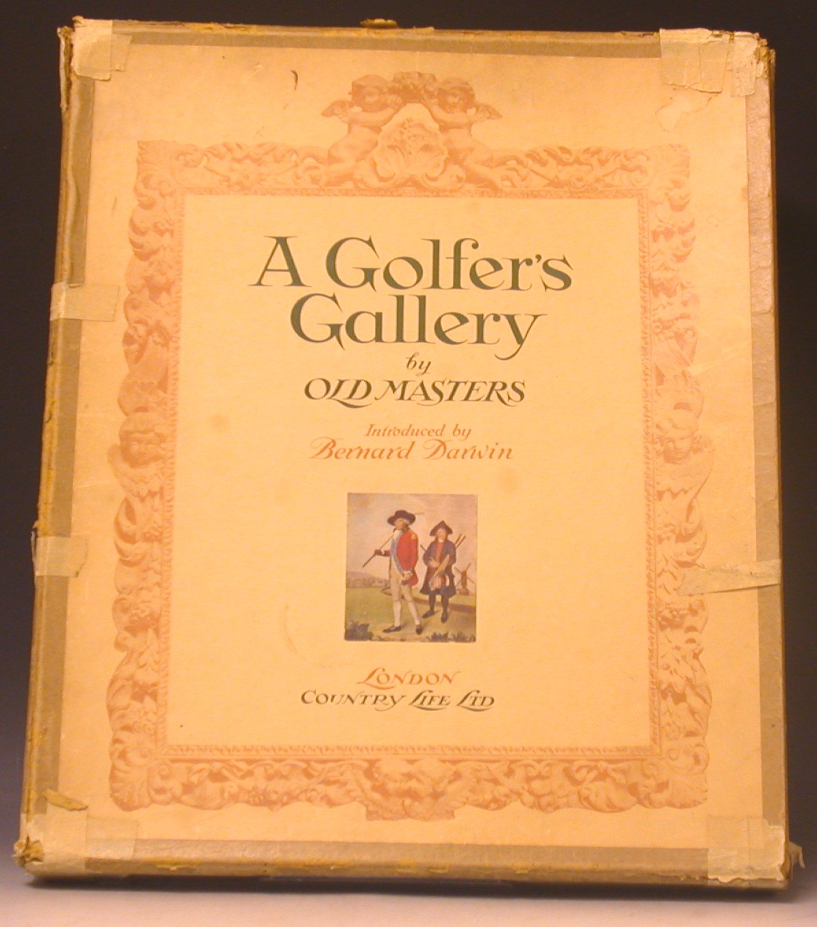 A Golfer's Gallery by Old Masters... 1st edition, introduction by Bernard Darwin, illustrated with eighteen full-page mounted colour plates of paintings depicting golf or golf relatives in different forms, from the 16th to the 19th centuries, plus other reproductions within the introduction, decorative green and black boards, paper cover label, in original decorative box, Country Life, London, circa.1920