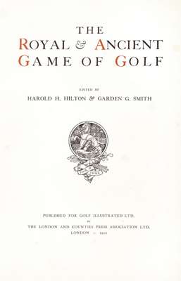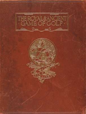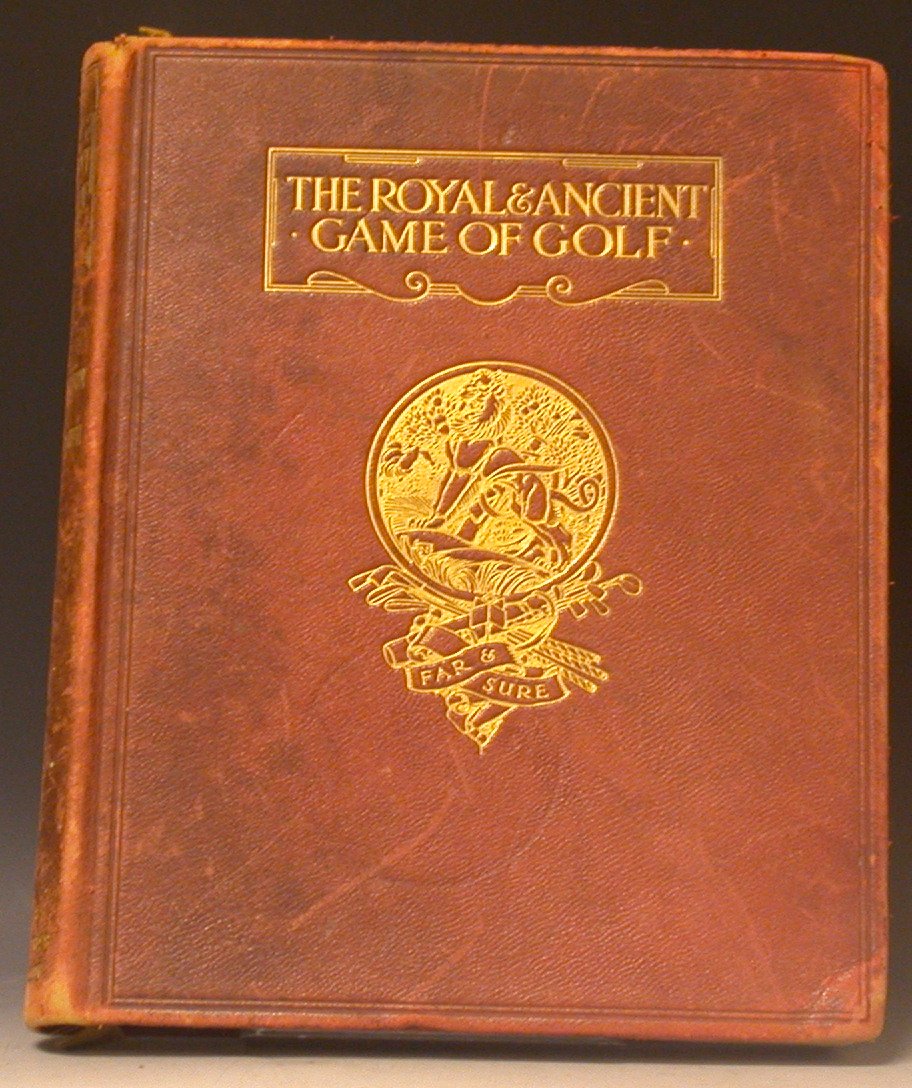 The Royal & Ancient Game of Golf... 1st edition, profusely illustrated from paintings and photographs, tissue guards, frontis., figure illustrations throughout text, original full red vellum, gilt-tooled pictorial lion emblem on front cover stamped in gilt, gilt lettering to cover and spine, white moiré silk endpapers, original ribbon bookmark present, a.e.g., London & Counties Press, London, 1912, No. 40 of 900 copies, The Subscriber's edition