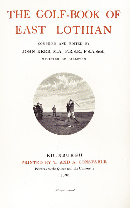 The Golf-Book of East Lothian... 1st edition (small paper), numerous illustrations throughout, including frontispiece with tissue-guard, tan cloth, gilt vignette stamped on the spine and front cover, gilt lettering, top edge stained red, blue-green endpapers, No. 351 of 500 hand-numbered copies, signed by the author, T. and A. Constable, Edinburgh, 1896