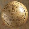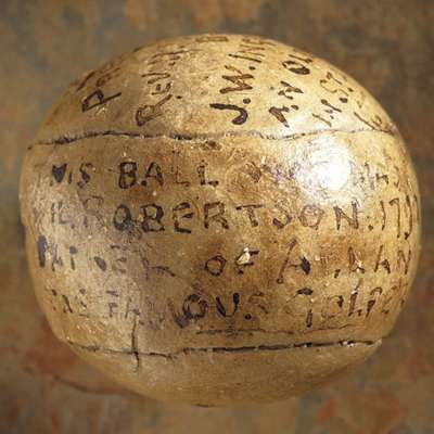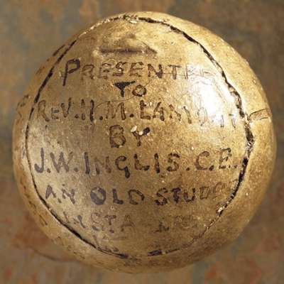 of unusual proportions, inscribed in ink to the top 'Presented to Rev. H.M. Lamont by J.w. Inglis C.b (?), an old student in St. Andrews, 18**' and to the side bearing also in ink 'This ball was made by Wil. Robertson, 1790, Father (?) of Allan , the famous golfer', with protected lacquer to ball.