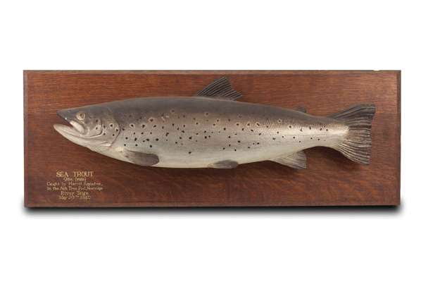 the rectangular oak backboard with moulded border inscribed "Sea Trout, 9lbs (male), caught by Harold Egginton, in the Ash Tree Pool, Newbridge, River Teign, May 29th 1946"