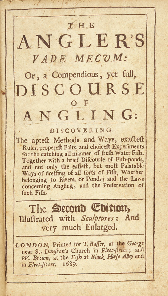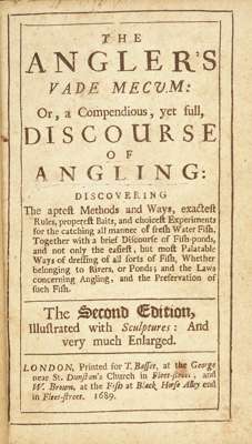 The angler's vade mecum: or, a compendious, yet full, discourse of angling ... 2nd edition, pp. [viii], 326, [x], with 2 engraved plates, later half calf, marbled boards, spine rubbed and worn, boards detached (lacking upper board), slight paper discolouration throughout, 8vo., London: Basset, 1689