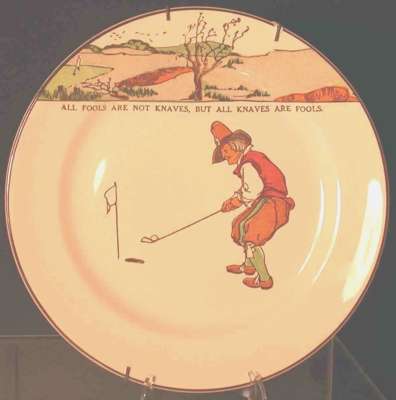 transfer printed and painted with Crombie golfers, and inscribed, 'All Fools Are Not Knaves, But All Knaves Are Fools',