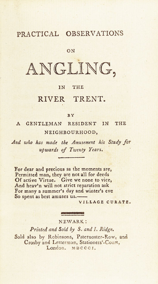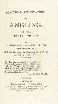 Practical observations on angling in the River Trent, by a gentleman resident in the neighbourhood ... 1st edition, contemporary blue straight grain morocco, spine decorated gilt in compartments, red lettering piece, by Store of Grantham, with the bookplate of Syston Park, 12mo., Newark: Ridge, 1801