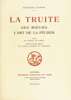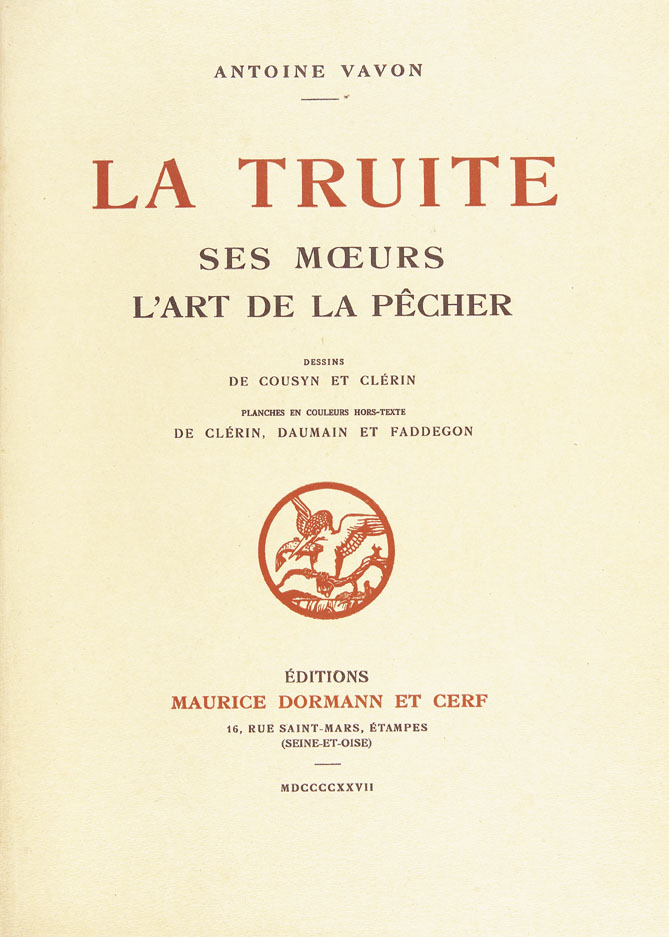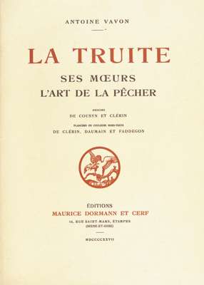 La truite: ses moeurs, l'art de la pecher ... 1st edition, illus., 11 coloured plates, head and tail pieces, full red morocco, gilt ruled, gilt image of a dragon fly in the centre of both panels, t.e.g., original printed paper covers bound in, by Bickers & Sons, joints and edges rubbed, blank prelims foxed, some incidental spots on the plates, 4to., Paris: Dormann et Cerf, 1926