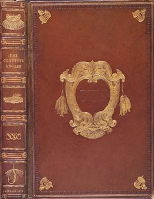 The complete angler ... with the lives of the authors and notes, historical, supplementary, and explanatory by Sir John Hawkins ... 9th edition, engraved port. frontis., 14 engraved plates, contemporary calf, covers with a central gilt cartouche formed by dolphins (based on the titlepage of the first edition), blind ruled border with gilt fishing reels at each corner, spine decorated gilt in compartments with piscatorial devices, by Gosden, neatly rebacked, with original backstrip laid down, some instances of foxing, London: Smith, 1822