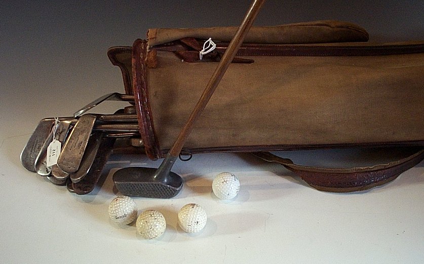 five irons stamped Henry & Bishop, a putter, five other various irons, a jigger, two putters in a canvas bag, a Bromford mesh ball and various dimple balls, a lot
