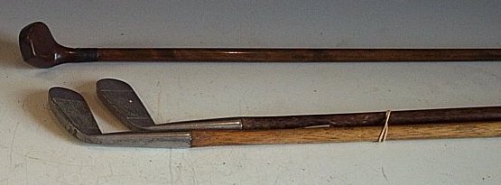 with horn insert and metal tip and two hickory shafted irons with rustless heads (3)