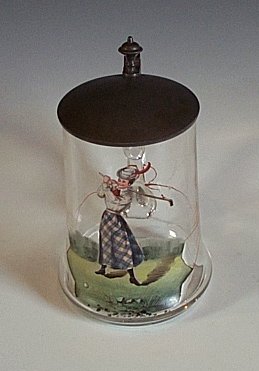 with hinged pewter lid and hand enamelled decoration of a lady golfer at the top of her swing
