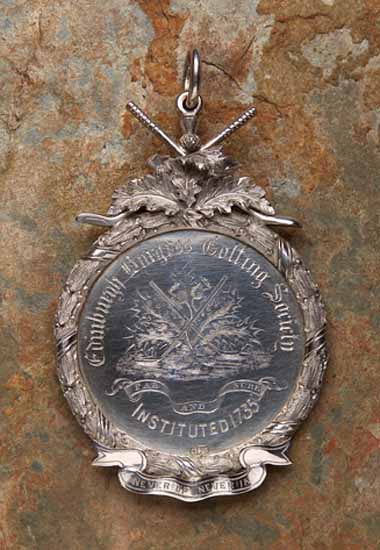 cased, with a thistle and oak leaves, crossed long nosed club behind, the medal of circular form enclosed in a wired ribbon band above a pennant, bears the motto, 'never up, never in', for Edinburgh Burgess Golfing Society, Instituted 1735, the centre with crossed clubs and three balls amidst thistles, the back engraved won by Mr John Cruikshank with 52 strokes, Edinburgh, 1 November 1873, makers mark only J.B