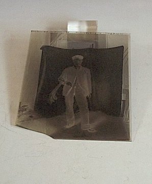 standing against a white cloth, holding a bag of clubs under his left arm, inscribed to the upper border, 'Photo of 'Fiery' for J.F. McClymont, Sandwick PI.48. 24/8/98',