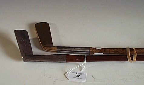 with original flat-fronted shaft and grip and a brass putter stamped Bussey & Co., London, 'Thistle,' with patent steel socket (2)