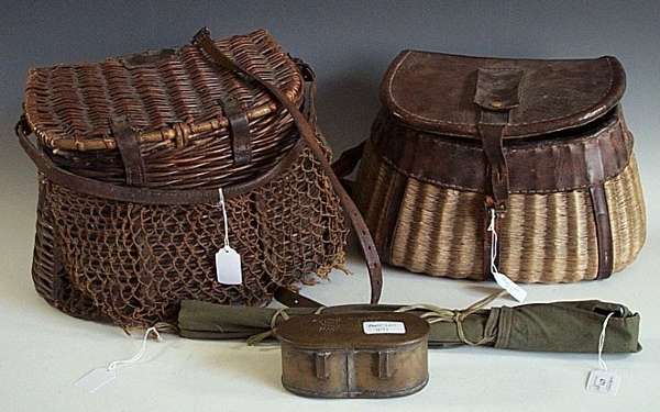 8ft, in a bag; two wicker fishing creels; a 2 1/2in brass platewind fly reel and a Victorian brass bait box, the hinged lid pierced initials "D.S." (5)