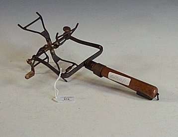 the wooden handle supporting a pitchfork frame, centred by four revolving struts with crank winding arm and horn handle
