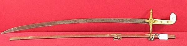 the single edged blade with etched decoration with VR surmounted by a crown, by Phelps of London, ivory grip in polished steel scabbard