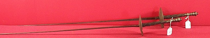 with spiral grips bound in steel wire, turned steel pommels, dished hilts with buff leather liners, the tapered blades of triangular section, with punched armourer's mark, in fine un-touched condition with original finish (2)
