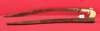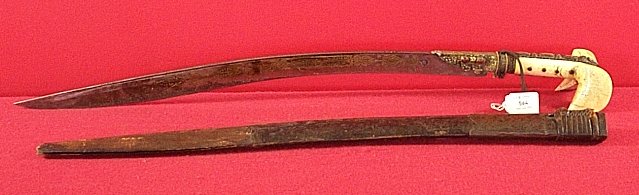 bifurcated bone hilt with applied strap inset with coral, single edged inlaid blade with gilt metal mount set with cabochon stones, the leather covered scabbard with chased metal mounts (lacking at tip)
