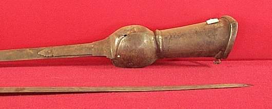 one hilt decorated with rouletting fluting and foliage unsigned double edged blade. Other with plain hilt, double edged blade, corrosion to both hilts.
