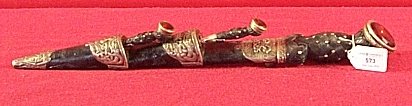 single edged blade with etched decoration maker's name of S.J. Pillin, 31 Gerrard Street, London. Hardwood hilt, the pommel inset with amber backed glass, the leather scabbard with silver plated mounts with repousse celtic mythical beasts, ducal coronet, cypher letters L crests and the mottoes, of the ducal family of Argyle & Sutherland, complete with by-knife and fork.