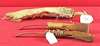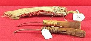 curved single edged blade with softwood grip, one contained in beaded deer skin scabbard (some loose beads) other with wormed curved grip.
