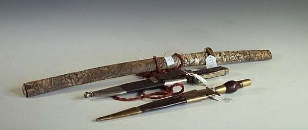 with double edged spear sharped blade, turned wooden hasp with brass mounts, embossed leather scabbard, an English (Sheffield) Bowie Knife, with single edge blade signed Joseph Rogers & Son, cuttlers to their majesties, Norfolk Street, Sheffield, German silver hilt and scabbard mounts, staghorn grip, and a Japanese Short sword (Wakizashi) with signed single edged blade with carved bone hilt and scabbard (3)