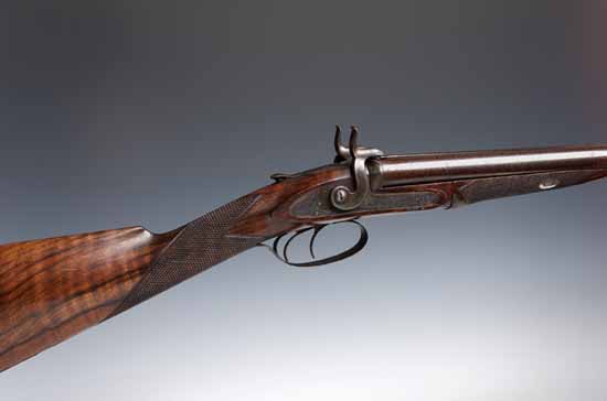 slide thumb lever, by Westley Richards London se.no 10490, with brown Damascus barrels engraved on the rib Westley Richards 170 New Bond Street, London, engraved locks, trigger, guard figured walnut staight stock chequered grip and forend. Black powder proof. Built in 1864