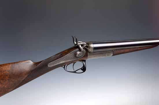 no.8261 by James Purdey the re blued barrels signed on the top rib J Purdey and son Audley House, South Audley Street, London, engraved back action locks, well figured walnut stock, chequered staight grip fore-end. The escutcheon engraved with E surmounted by a royal crown, black powder proof. The makers confirm that they were built in 1870 as a pair for W. Rennie Esq.