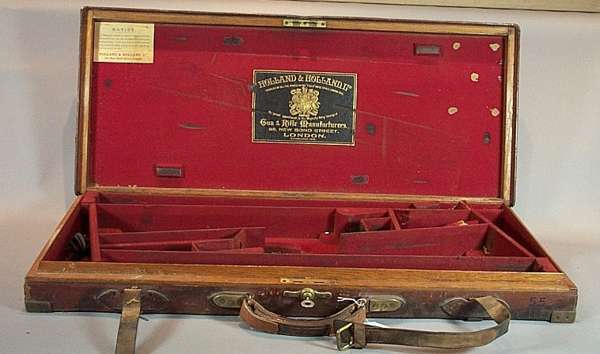the first for a pair of 26" barrels. Holland & Holland 12 bore shotguns. The second a leather rifle case for a Holland & Holland .360 double rifle, 26" barrels