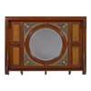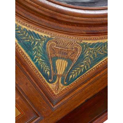 oak, with inset panels of stained walnut, ebony, holly and mahogany, painted gesso and string, mirrored plate, painted gesso Japanese Noh mask decorator's cypher to the reverse, plate grooves to the top of the cornice