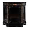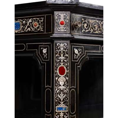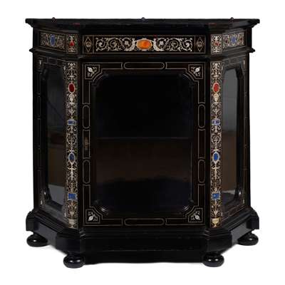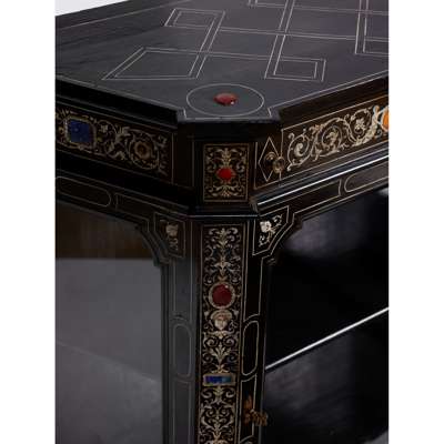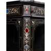 ebonised wood with ivory inlay, set with semi-precious stones including agate and lapis lazuli, glazed panels