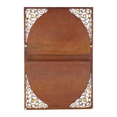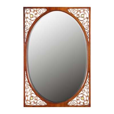 mahogany with bevelled mirrored plate, and copper filagree set with opalescent cabochons