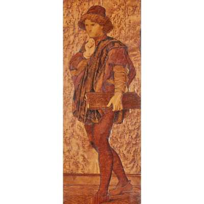 painted and inlaid specimen woods within original oak framed, signed lower left and dated JAMES F.F. CAMM/ 1911