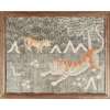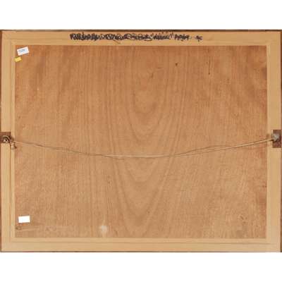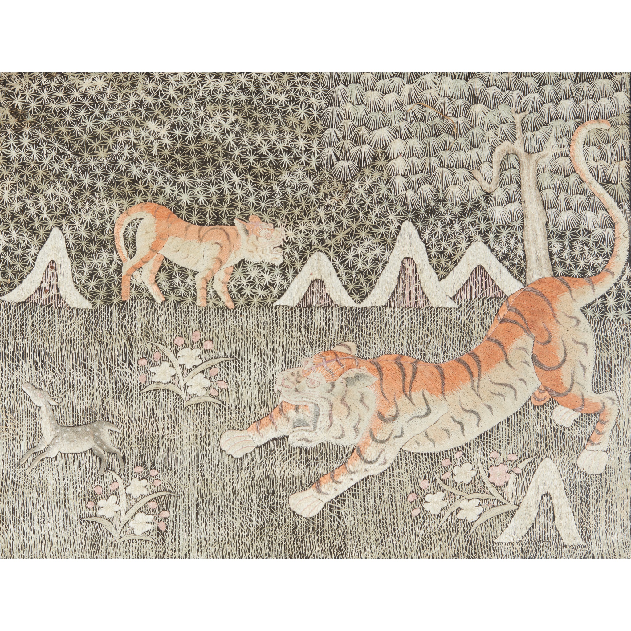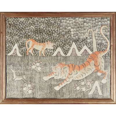 coloured silks, silk threads and raised work, black cotton ground, later framed