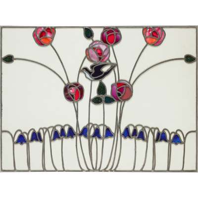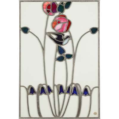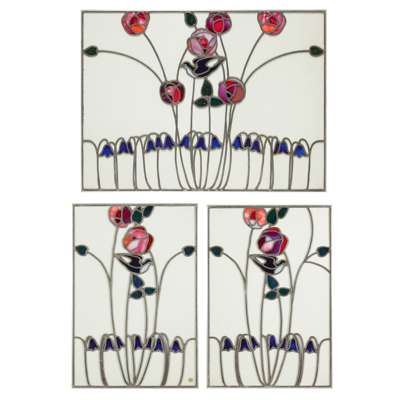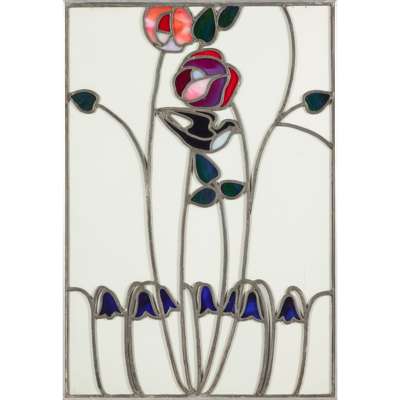 stained, leaded and clear glass, with later frames mounted to painted board ground