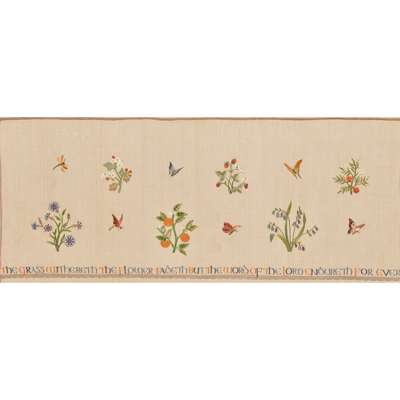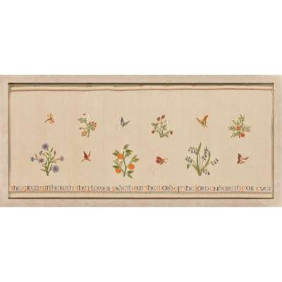 coloured silks on a linen ground, with embroidered eyelets, bears embroidered inscription, The Grass Withereth The Flower Fadeth But The Word Of The Lord Endureth Forever, later framed