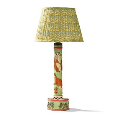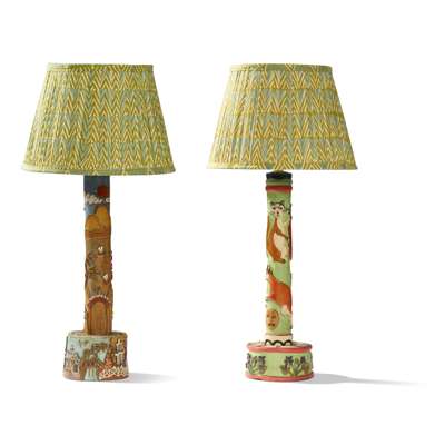 carved and painted wood, comprising a HEY DIDDLE DIDDLE LAMP, carved makers mark and date to base J.T BARLOW, BIDDULPH/ 1964, 41cm high; together with a WILLOW PATTERN LAMP, carved makers mark and date to base J.T BARLOW, BIDDULPH/ 1965, 40cm high to fitting, each with later pleated shade