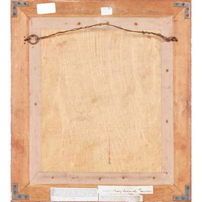 appliqué ‘fabric mosaic panel’, painted silk, with applied signature lower right MARY IRELAND, inscribed verso N.B. THE BLUE SILK USED IN THIS PICTURE IS ACTUALLY OF THE PERIOD) FABRIC MOSAIC BY MARY IRELAND/ OCTOBER 1936
