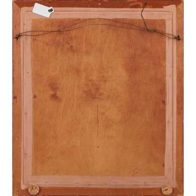 appliqué fabric mosaic panel, mixed fabrics and painted silk, with applied signature lower left MARY IRELAND, artist’s inscriptions verso FABRIC MOSAIC PANEL BY MARY IRELAND/ FROM STUDY 1934 (FABRIC ALTERED 1950), original frame