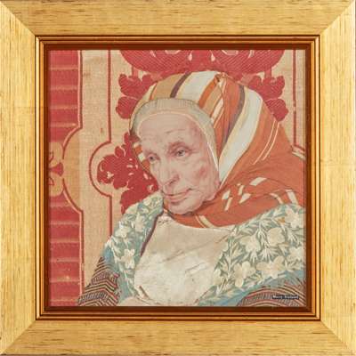 appliqué ‘fabric mosaic panel’, painted silk, with applied signature lower right MARY IRELAND, later framed