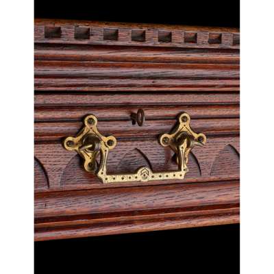 Note: Alfred Waterhouse is perhaps best remembered as the architect of the Natural History Museum in London. The furniture he conceived was for his own buildings. He designed all the furniture for the Earl of Selborne’s Blackmoor House in Hampshire and this current desk is similar in form and proportions to one created for the Earl.