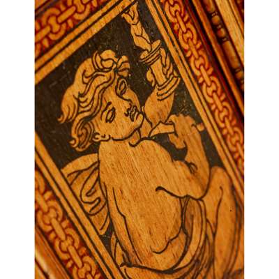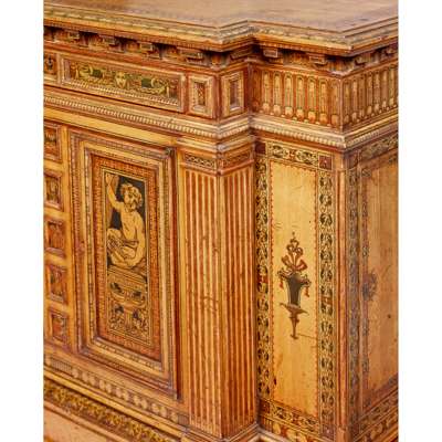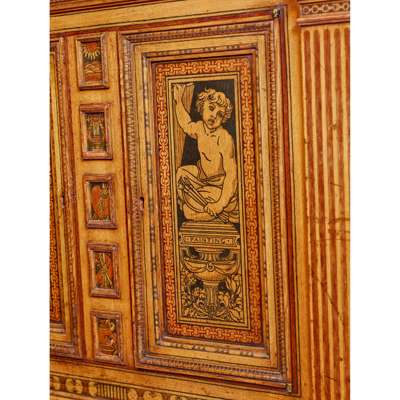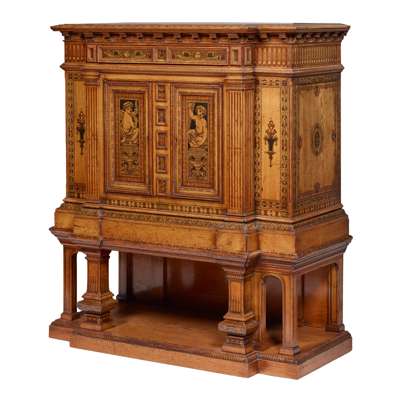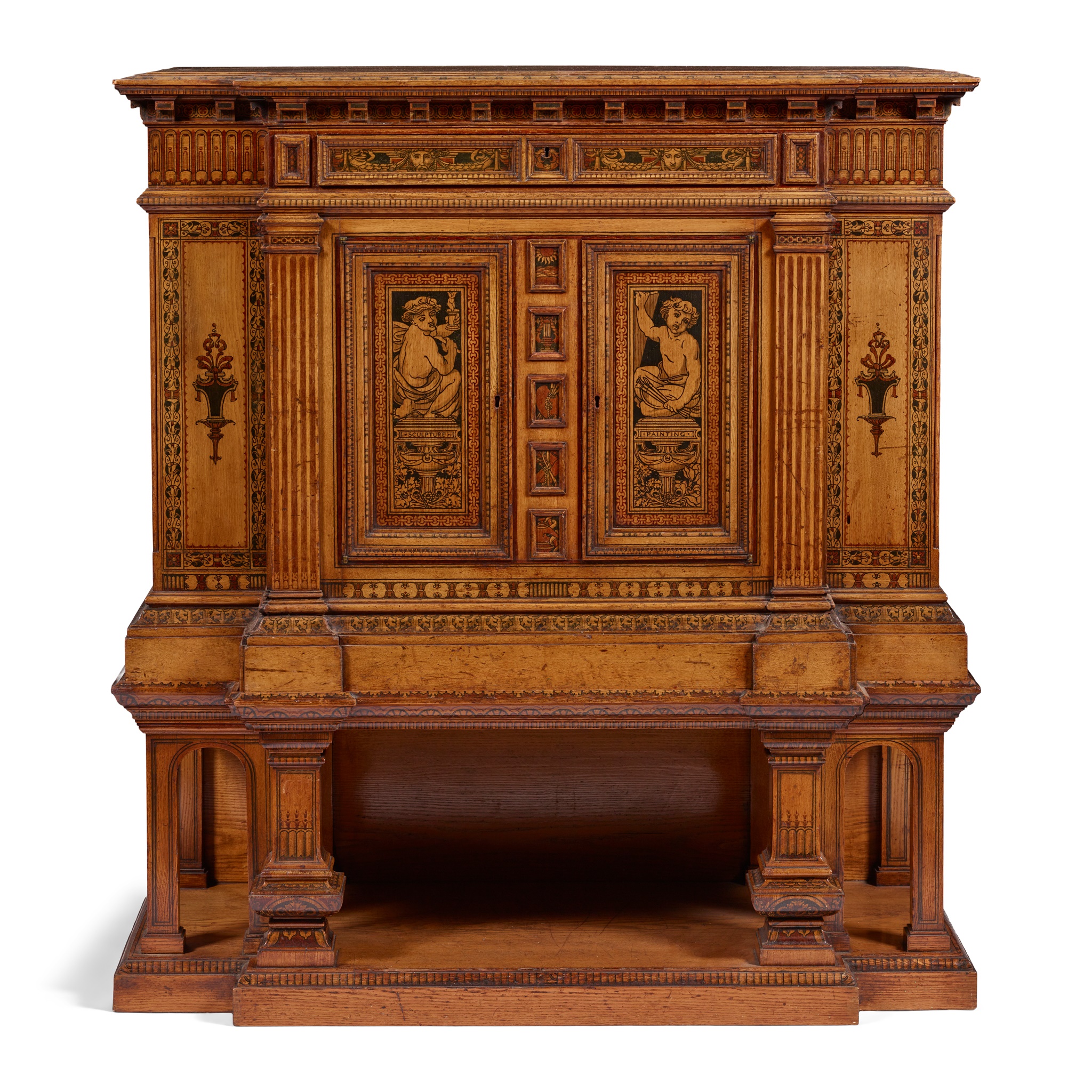 Note: The style of the cabinet is unusual within the context of British cabinet making, in that it is painted in a neo-renaissance manner, in red and black on light wood. This is a feature that was also employed on a piano designed by James Gamble and made for Henry Cole, now in the collection of the V&A in London.