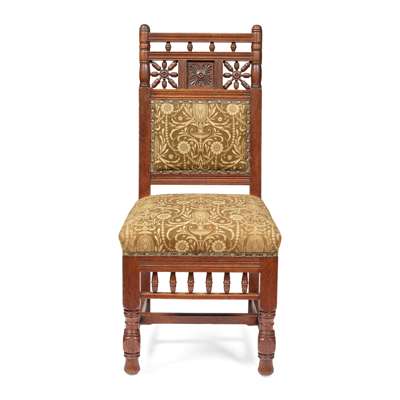 Note: An advertisement card for Henry Capel’s Art Furniture of around 1875 illustrates a similar chair to the present lot. Henry Capel was one of several furniture manufacturers who specialised in 'art furniture'. The advertisement shows some of the characteristic examples of this style of furnishing: lighter spindle-turned furniture, the use of painted panels and tiles particularly with figurative designs, and reformist Gothic designs. Capel worked particularly closely with Alfred Waterhouse, producing furniture and fittings for over 30 of Waterhouse's buildings. Waterhouse probably drew the designs for these projects, which reflect his interest in Gothic and medieval architecture. Capel is recorded as working throughout the 1870s and exhibited at the Paris Universal Exhibition of 1878.