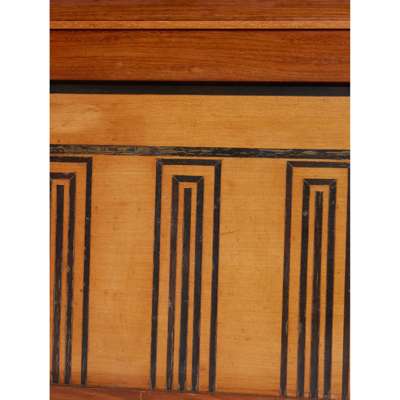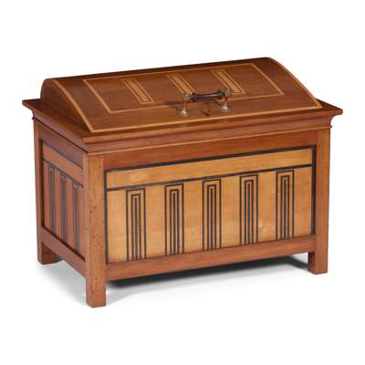 Note: The form and inlay of this box closely relate in form and decoration to a jewellery chest and a cosmetics coffer of the 12th Dynasty, reign of Senwosret II–Amenemhat III, circa 1887–1813 B.C. Owen Jones was also one of the most influential design theorists of the nineteenth century. His seminal publication, The Grammar of Ornament, the global and historical design sourcebook has never been out of print. Jones was Superintendent of the Works of the Great Exhibition in 1851 and in 1852 joint Director of Decoration of the Crystal Palace. When this building was removed to Sydenham he designed the Egyptian, Greek, Roman and Alhambra Courts. The monumental centrepiece of the Egyptian Court also incorporates decorative elements found on this chest. The use of dark and light, foreign and native timbers in this piece of furniture are reflected in work designed by Jones for Eynsham Hall, Oxfordshire, and reflected his interest in unconventional combinations of materials typical of furniture produced by specialist firms such as Jackson & Graham.