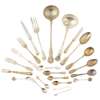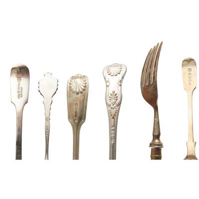 mostly Shell and Thread pattern and Fiddle Pattern, with slight variations in style, comprising: four large serving forks; five large serving spoons; two ladles; ten soup spoons; twelve dessert spoons; fourteen dinner forks; twenty three various dessert forks; three fruit forks; eleven fruit knives; fourteen dinner knives, together with an assortment of various teaspoons, condiment spoons and sugar tongs (qty)