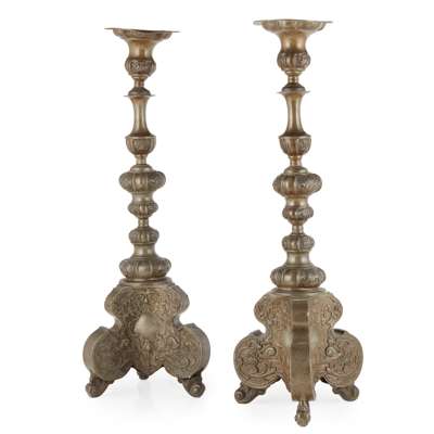 PAIR OF RENAISSANCE STYLE PATINATED METAL PRICKET STICKS