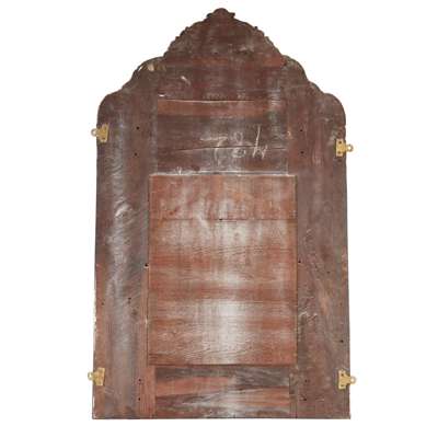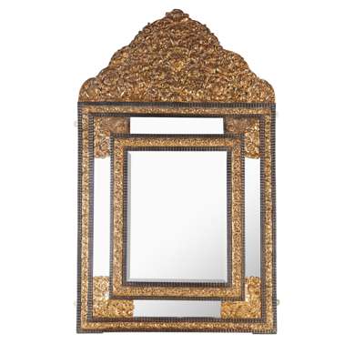 the rectangular mirror plate enclosed by margin plates enclosed by ripple cut mouldings and brass foliate mounts, surmounted by a pierced and repousse brass cresting with flower heads and foliate scrolls