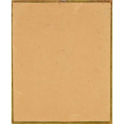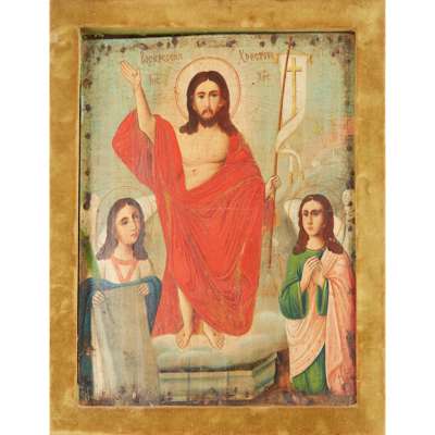 Christ depicted in red draped raiments holding the Christian banner with his other hand raised in blessing, a pair of kneeling angels at this feet, on panel and later box frame