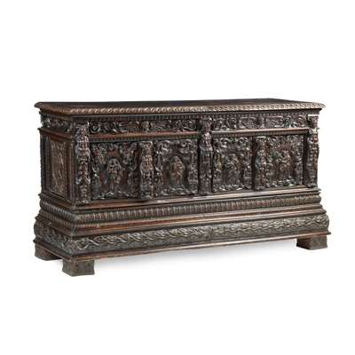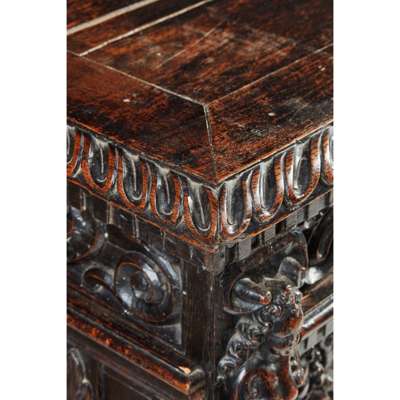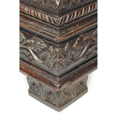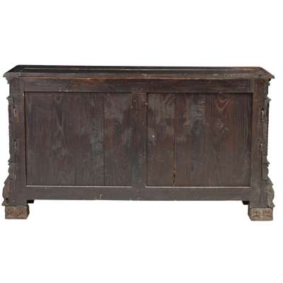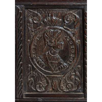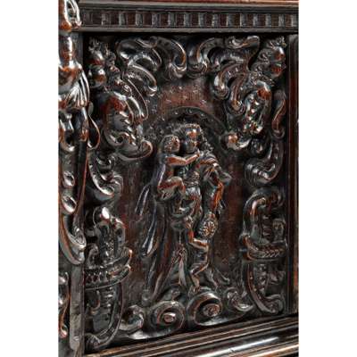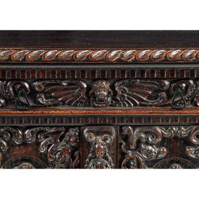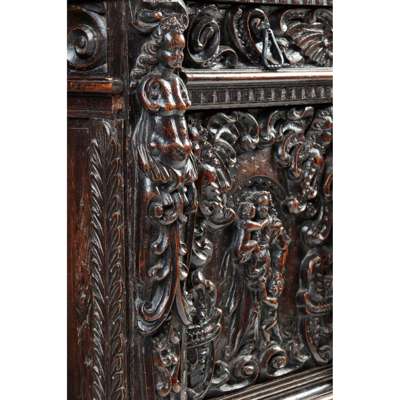 the top with a gadrooned edge above a pair of frieze drawers, over a pair of doors carved with four niches enclosing figures, the sides with Romayne panels, on a base with carved and moulded bands of gadrooning and leafy vines, raised on carved block feet