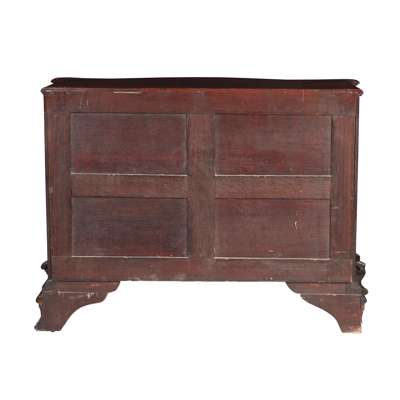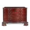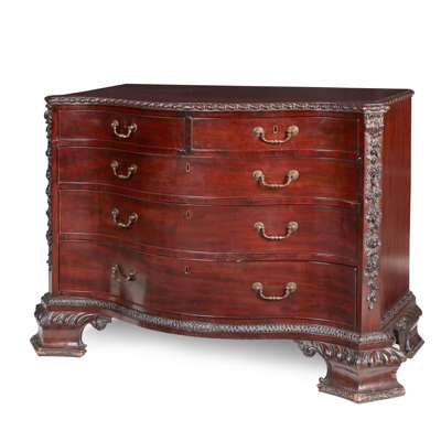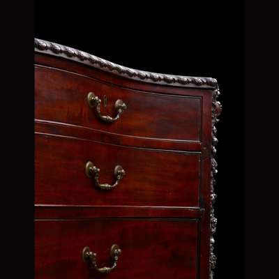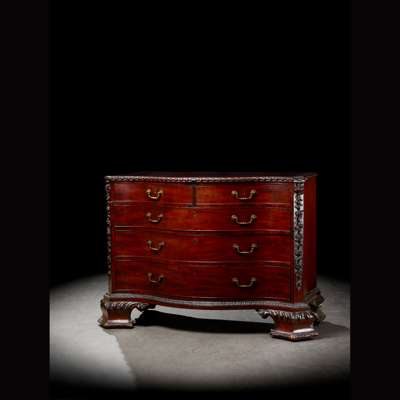 Note: One of two chests of drawers supplied by James Blaikie to Penicuik House in 1769, and listed as a ‘half-Chest' in Sir James' journal. Blaikie, as the principle carpenter on the development of the Penicuik interiors and furniture, would have acted as agent and had the chest made by an Edinburgh cabinetmaker to his specifications. The two chests of drawers supplied came with a combined bill of £4 10s and are heavily influenced by designs from Chippendale's Director. This example, slightly squatter than its counterpart, lot 60, is embellished with rich carving to its edge moulding and angles, and sits on pronounced C-scroll carved ogee bracket feet, and is similar to chests made by the London cabinetmaker William Gomm. Frustratingly, the names of these craftsmen don't appear in the journal of Sir James.