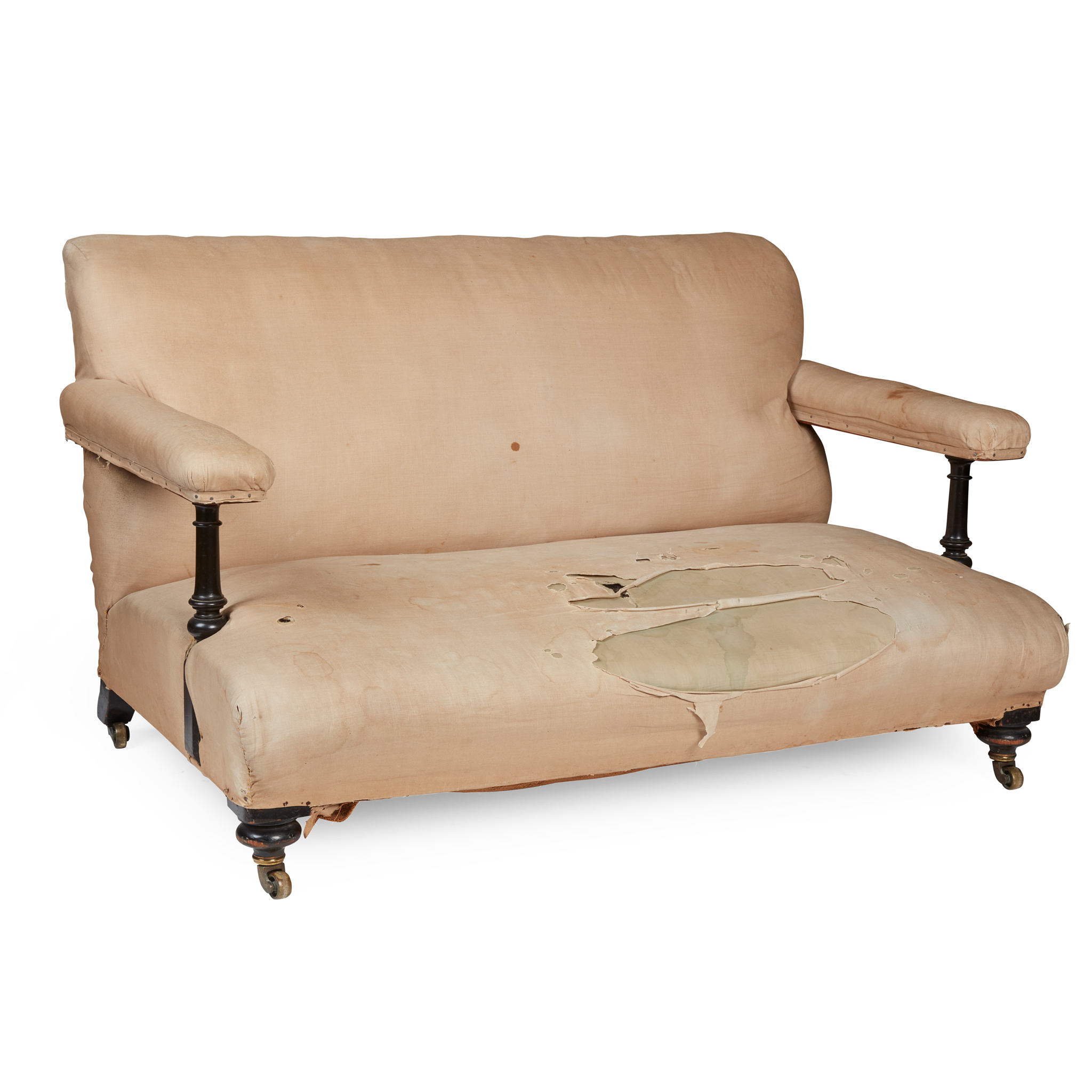 the low cushioned back and seat flanked by padded open arms with turned supports, raised on turned feet with brass caps and castors